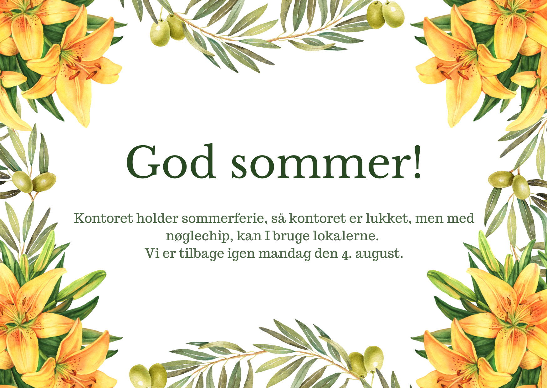 Kontoret holder sommerferielukket - vi er tilbage igen mandag den 4. august, hvor vi igen besvarer henvendelser.